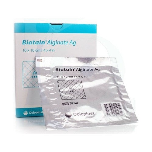 Biatain Alginate Ag is a highly absorbent silver alginate dressing for moderately to heavily exuding infected wounds of any size, shape and depth. Biatain Alginate Ag contains a silver complex to provide continuous antibacterial effect during the entire wear time (up to 7 days). Biatain Alginate Ag is indicated for high exuding wounds that are infected or at risk of infection deeper than 2cm or where undermining is present.