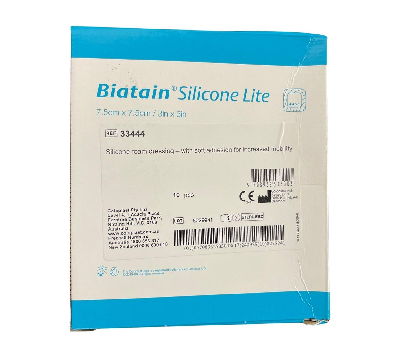 Biatain Silicone Lite adhesive dressing is a thin, ultra flexible and absorbent polyurethane foam dressing with a semi-permeable, water- and bacteria proof top film and a soft silicone adhesive.