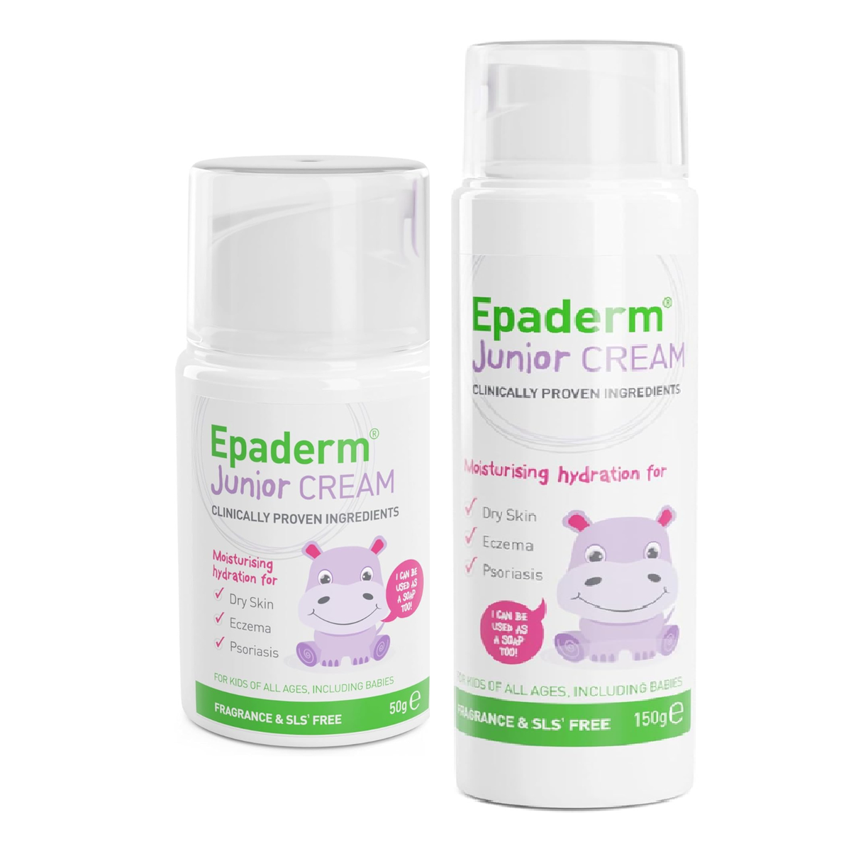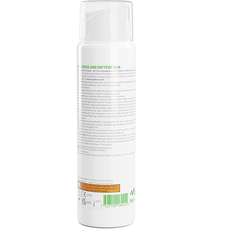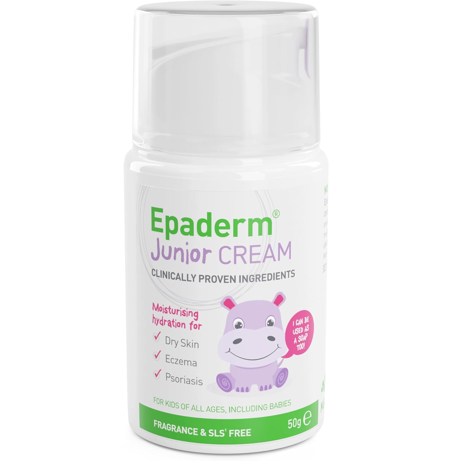 Epaderm Junior Cream is a gentle, fragrance-free moisturising cream specially formulated for young, sensitive skin. This cream provides soothing hydration for dry skin conditions and can be used daily as part of a skincare routine. The light, easily absorbed formula is suitable for all ages, including newborns, making it an ideal choice for the whole family. Perfect for managing dry skin, the cream helps maintain skin hydration throughout the day. The convenient pump bottle design ensures hygienic application and easy dispensing. Free from SLS and other harsh chemicals, this cream is particularly suitable for delicate skin that needs extra care and protection. Regular use helps maintain skin's natural moisture balance and provides a protective barrier against everyday dryness. The cream can be applied as often as needed and is gentle enough for daily use on face and body.