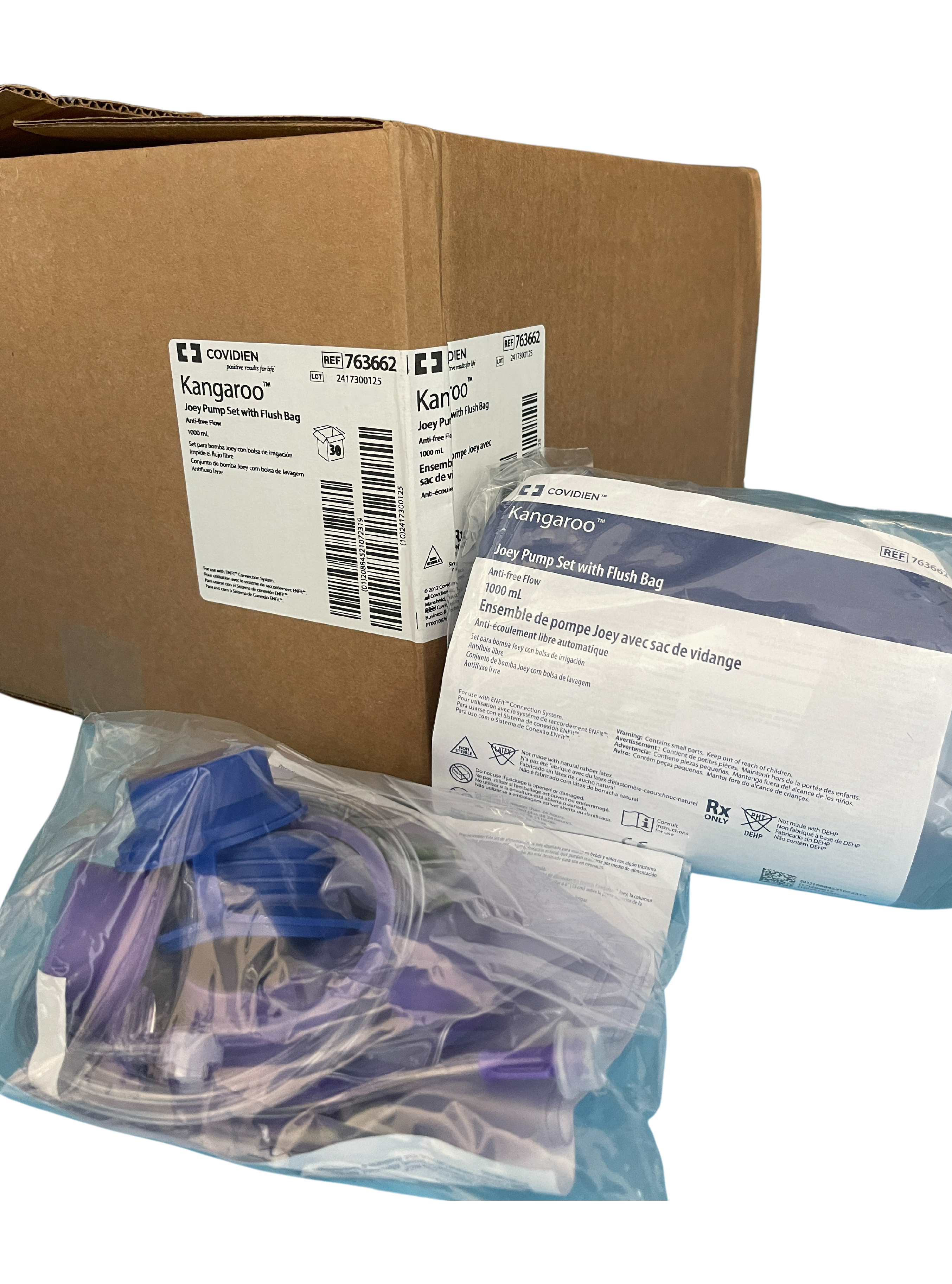 The Covidien Kangaroo Joey Pump 1000mL Feed And Flush Set, Box of 30 (763662) offers a reliable and safe solution for enteral feeding and flushing. Engineered with precision, these Kangaroo Feeding Sets are designed with ENFit connectors, guaranteeing seamless compatibility with the ISO standard 80369-3. This vital feature minimizes the potential for medical device tubing misconnections, thereby enhancing patient safety during enteral feeding procedures.