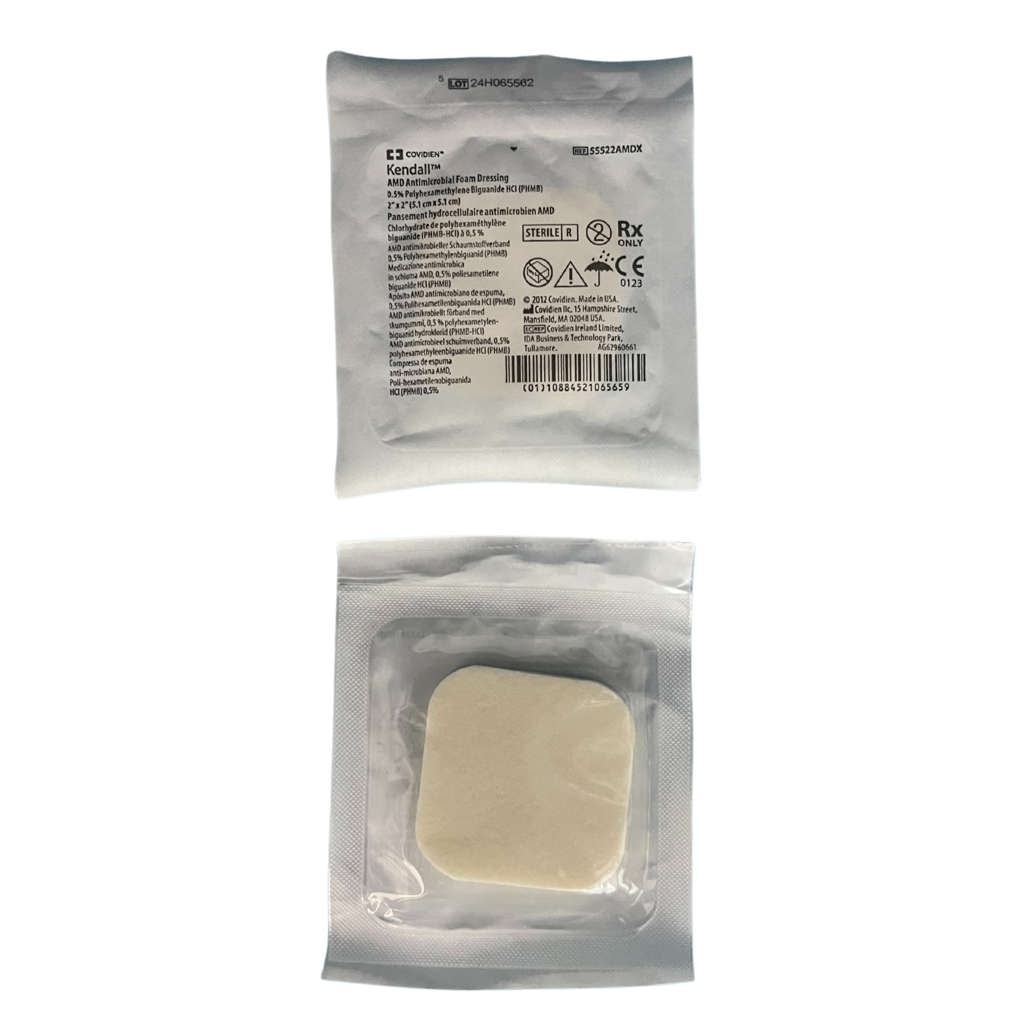 AMD FOAM 5cmx5cm 55522AMDX 5cmx5cm A better wound environment leads to better patient outcomes. Kendall? AMD antimicrobial foam dressings provide an ideal healing environment by simultaneously managing moisture and bacteria in the dressing. As the foam dressing absorbs exudate, Polyhexamethylene Biguanide (PHMB) ? a powerful yet safe antiseptic ? targets and kills bacteria on contact.