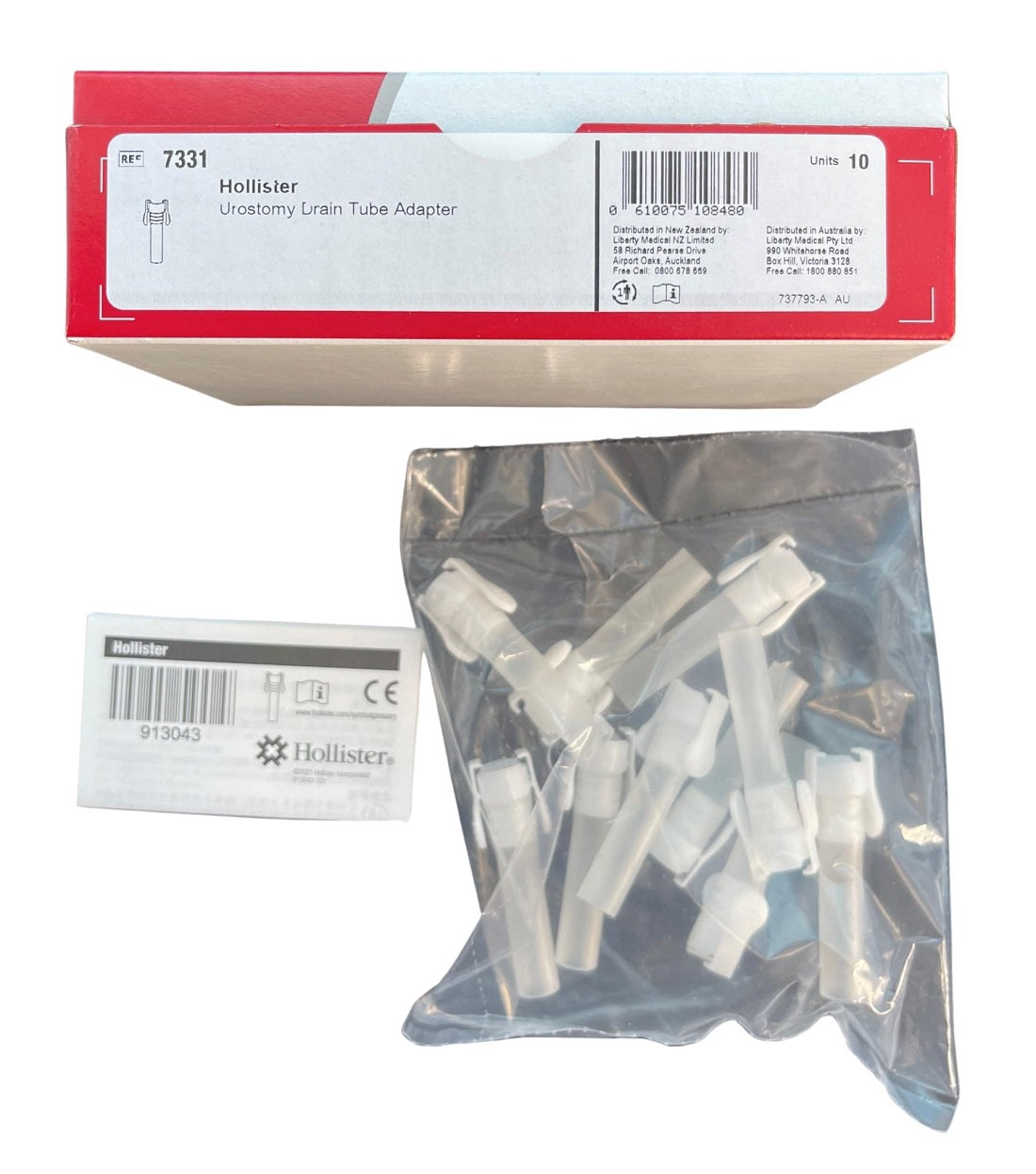 The adaptor is used to provide a secure connection of the tap of a Hollister urostomy pouch to a bedside urine collector or leg bag.