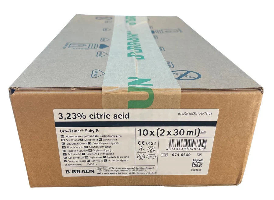 In conclusion, the B. Braun Uro-Tainer Twin Suby G 2 X 30Ml Citric Acid 3.23% Twin Pack 9746609 is a top-quality product that offers convenience and peace of mind to both healthcare providers and patients. Its carefully designed formulation and user-friendly packaging make it an essential tool for urological care.