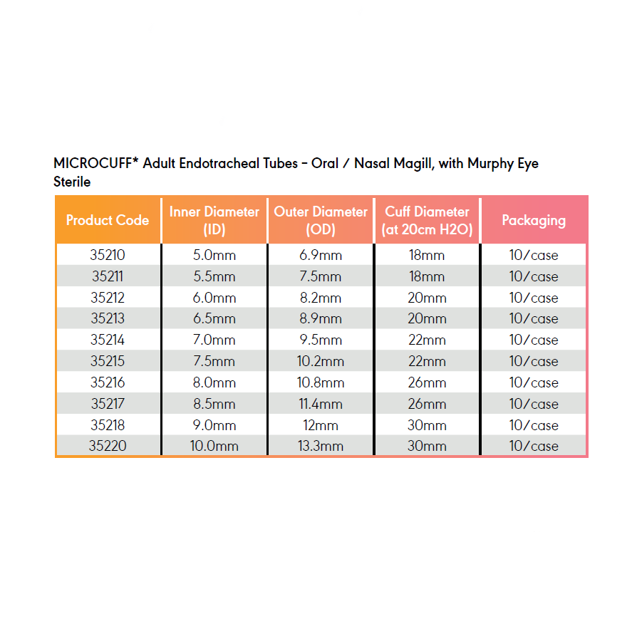 | 35220 | MICROCUFF Adult Endotracheal Tube Oral/Nasal Magill with Murphy Eye | 10.0mm |