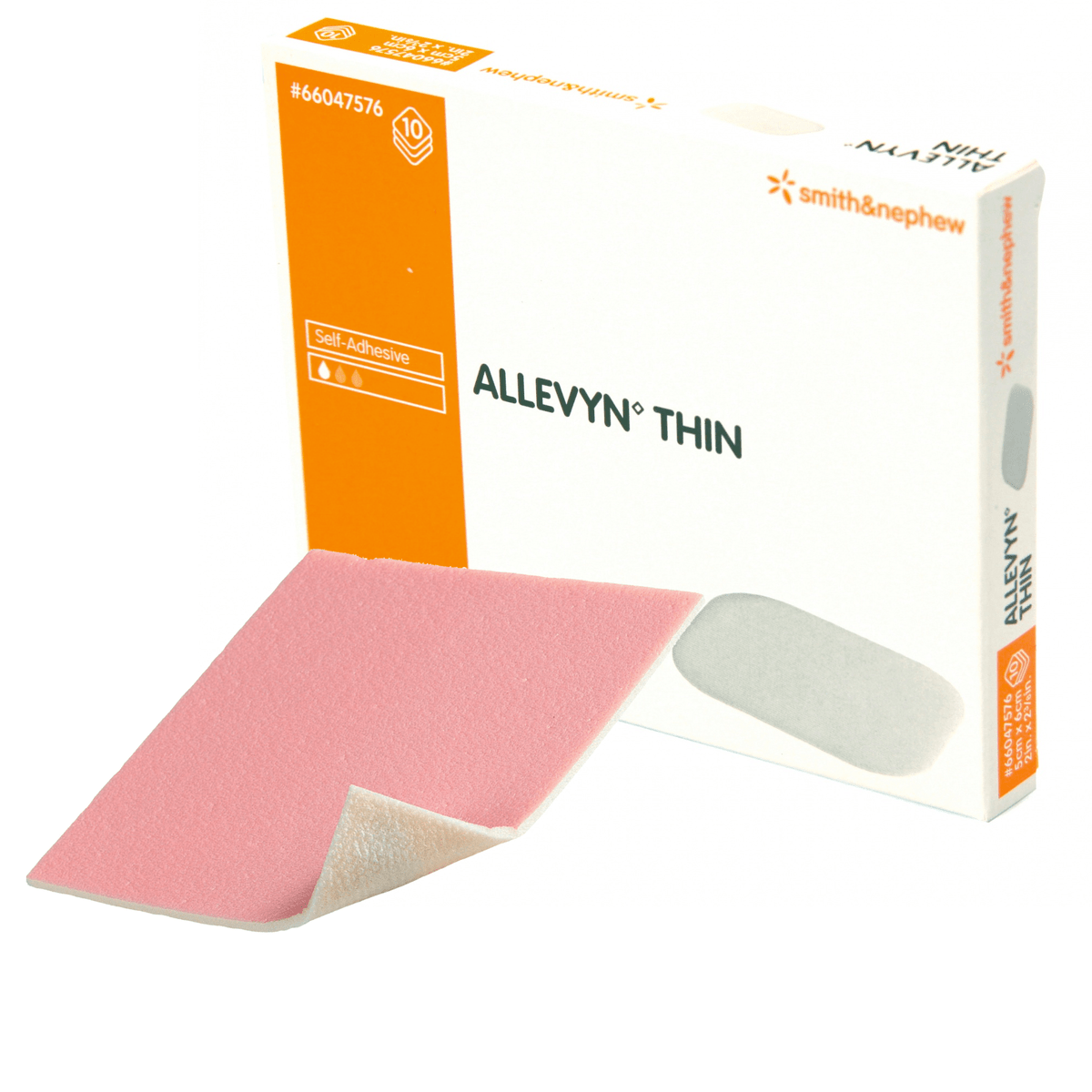 Smith & Nephew Allevyn Thin Dressing is sterile and made from polyurethane matrix and a polyurethane top film designed for use on a variety of wounds. Allevyn Thin is capable of managing low to moderate exudative surface wounds including minor burns and abrasions. This dressing can be used for the management of partially thick wounds such as leg ulcers, donor sites, post-op wounds, pressure ulcers and second degree burns under a health professional's direction. Allevyn Thin Dressing should not be used with oxidizing agents like hydrogen peroxide solutions or hypochlorite solutions. In addition, this dressing should not be used with exposed muscle, tendon or bone, on damaged or sensitive skin and where a risk of drying out exists.