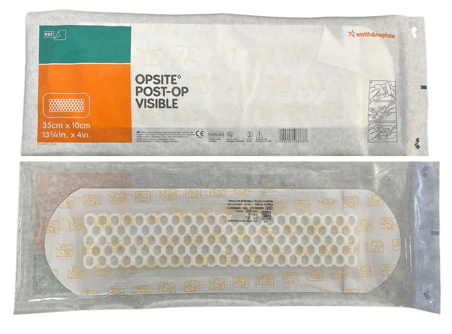 OpSite Post-Op Visible is a transparent film with a unique see-through absorbent pad. The highly breathable film is waterproof and bacteria-resistant, and the unique lattice structure foam pad enables regular wound assessment without the need to lift or remove the dressing.