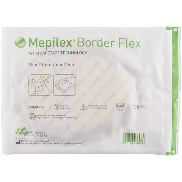 Mepilex Border Flex Oval is designed to adapt to body contours and used for a variety of exuding wounds including leg and foot ulcers, pressure ulcers and traumatic wounds such as skin tears or surgical wounds. These dressings are also used on dry or necrotic wounds combined with gels and for preventing skin damage as part of a prophylactic therapy.