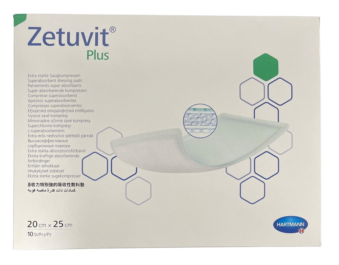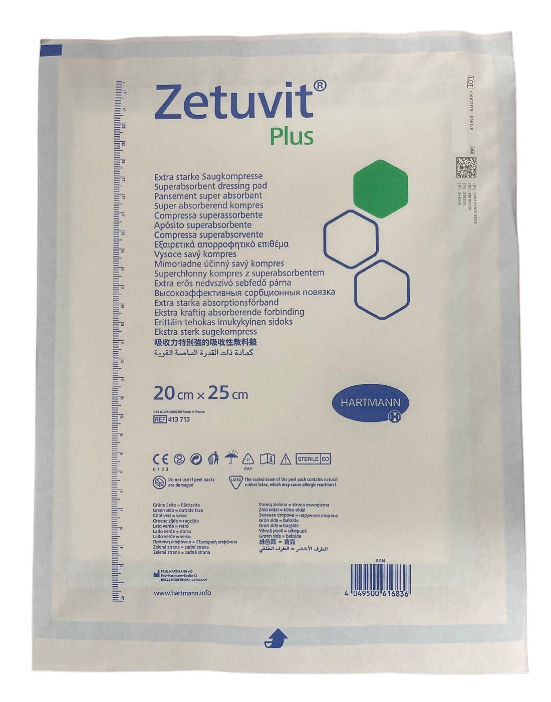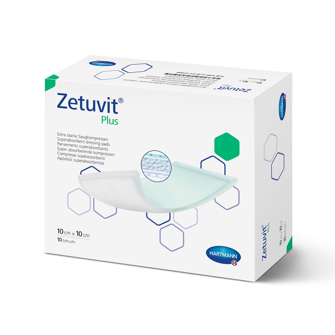 Zetuvit Plus is a combined superabsorbent dressing which consists of four layers of different materials. On the wound side, the product features a soft, white, hydrophilic nonwoven (viscose and polyamide). The inner dressing core consists of soft cellulose fluff blended with liquid-retaining polyacrylate polymers. This absorbent core is enclosed in a thin nonwoven fabric that evenly distributes the liquid. On the side facing away from the wound, the product features a green layer of polypropylene nonwoven, which is water-repellent but permeable to air and allows for gas exchange. Zetuvit Plus is a sterile superabsorbent dressing used on superficial, moderately to severely exuding wounds (traumatic wounds, post-operative wounds, lymphatic wounds, arterial leg ulcers) and chronic wounds (decubitus/pressure sores, venous or mixed leg ulcers, tumor wounds). The absorbent core absorbs and binds exudate.