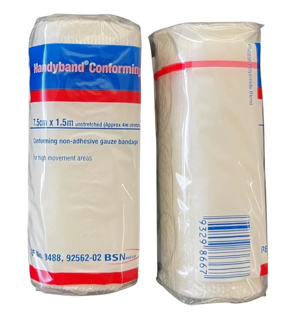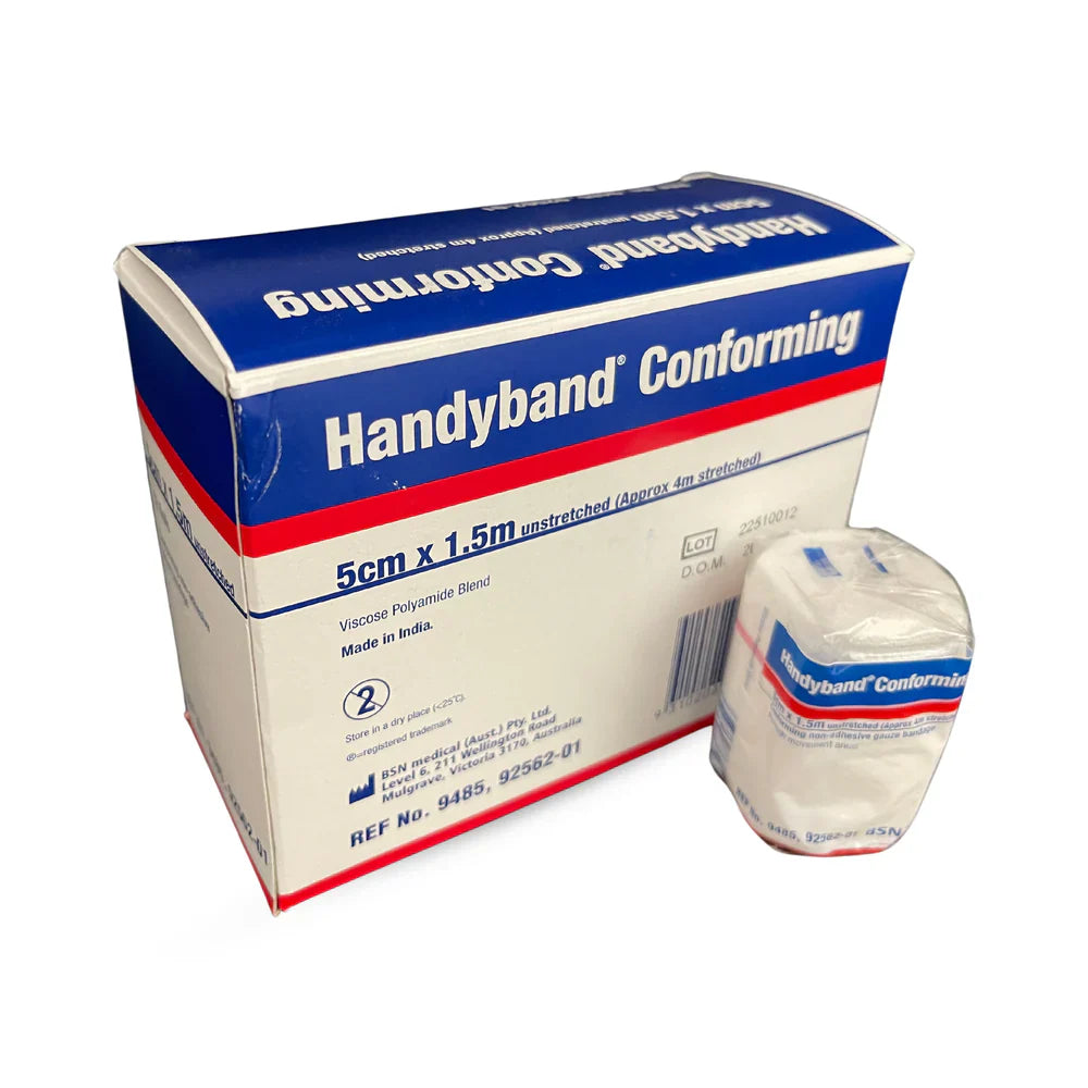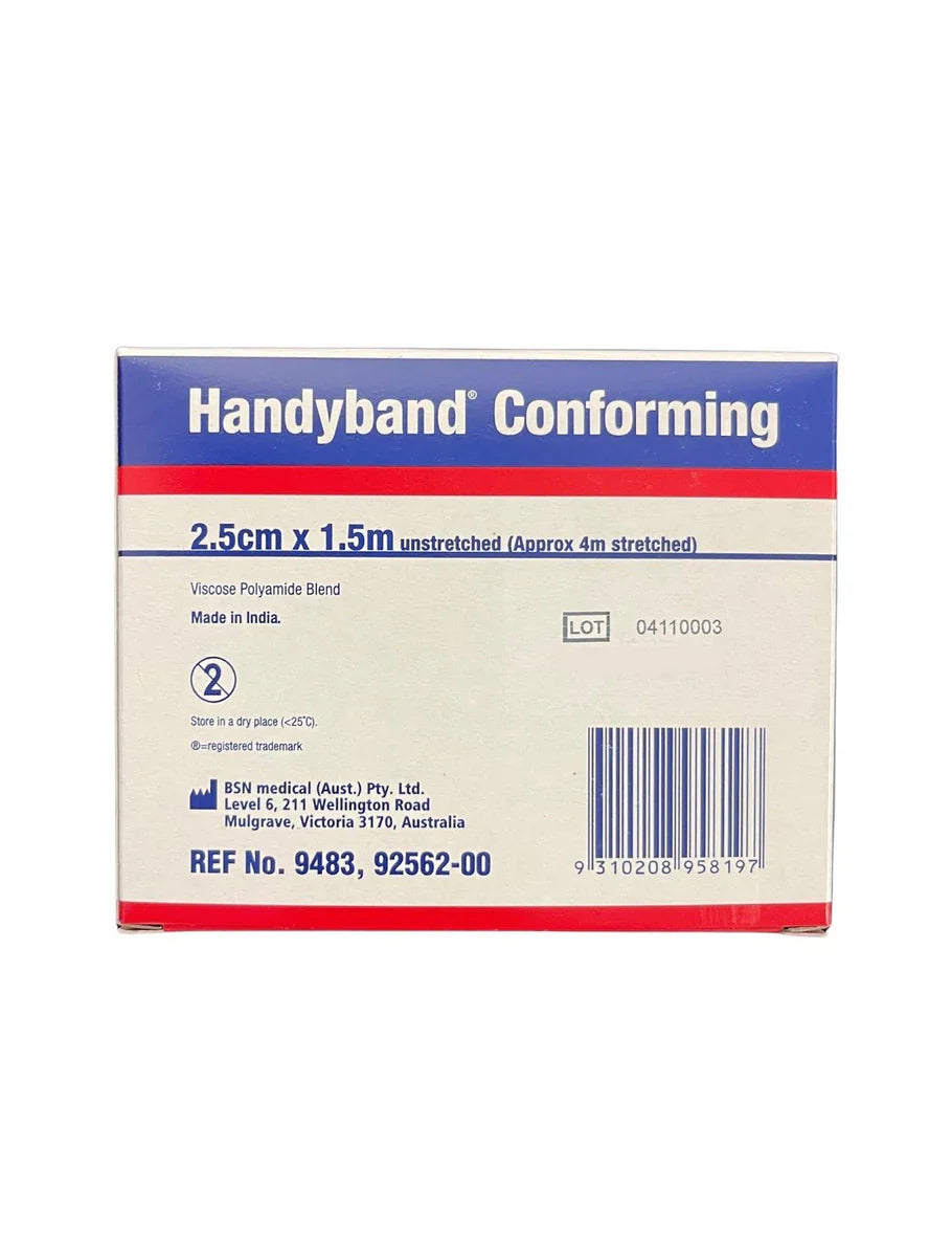 HANDYBAND BANDAGE CONFORMING GAUZE BANDAGE Handyband Conforming is a light, soft, white elastic bandage for dressing retention on high-body-movement areas such as joints. Ideal for active patients, Handyband Conforming is cool and low-bulk. It is highly durable and washable, so it can be re-used, even after prolonged use.
