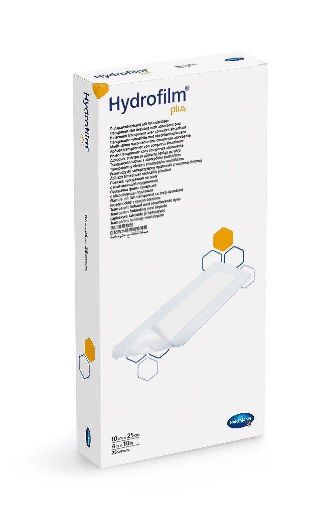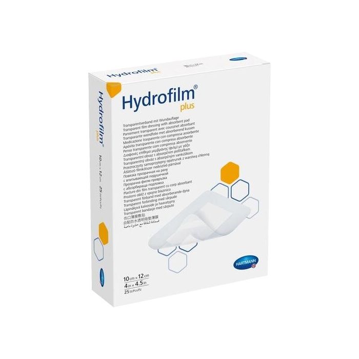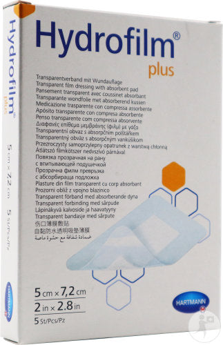 Hartmann Hydrofilm Plus is a self-adhesive, transparent wound dressing with an absorbent, low adhesive and hypoallergenic wound dressing pad. Hydrofilm Plus features a semi-permeable polyurethane film, which is waterproof and impermeable to germs. It can be removed without wound irritation. Hydrofilm Plus is designed for the treatment of slightly exuding wounds, as protection from secondary infections and for the sterile treatment of minor injuries.