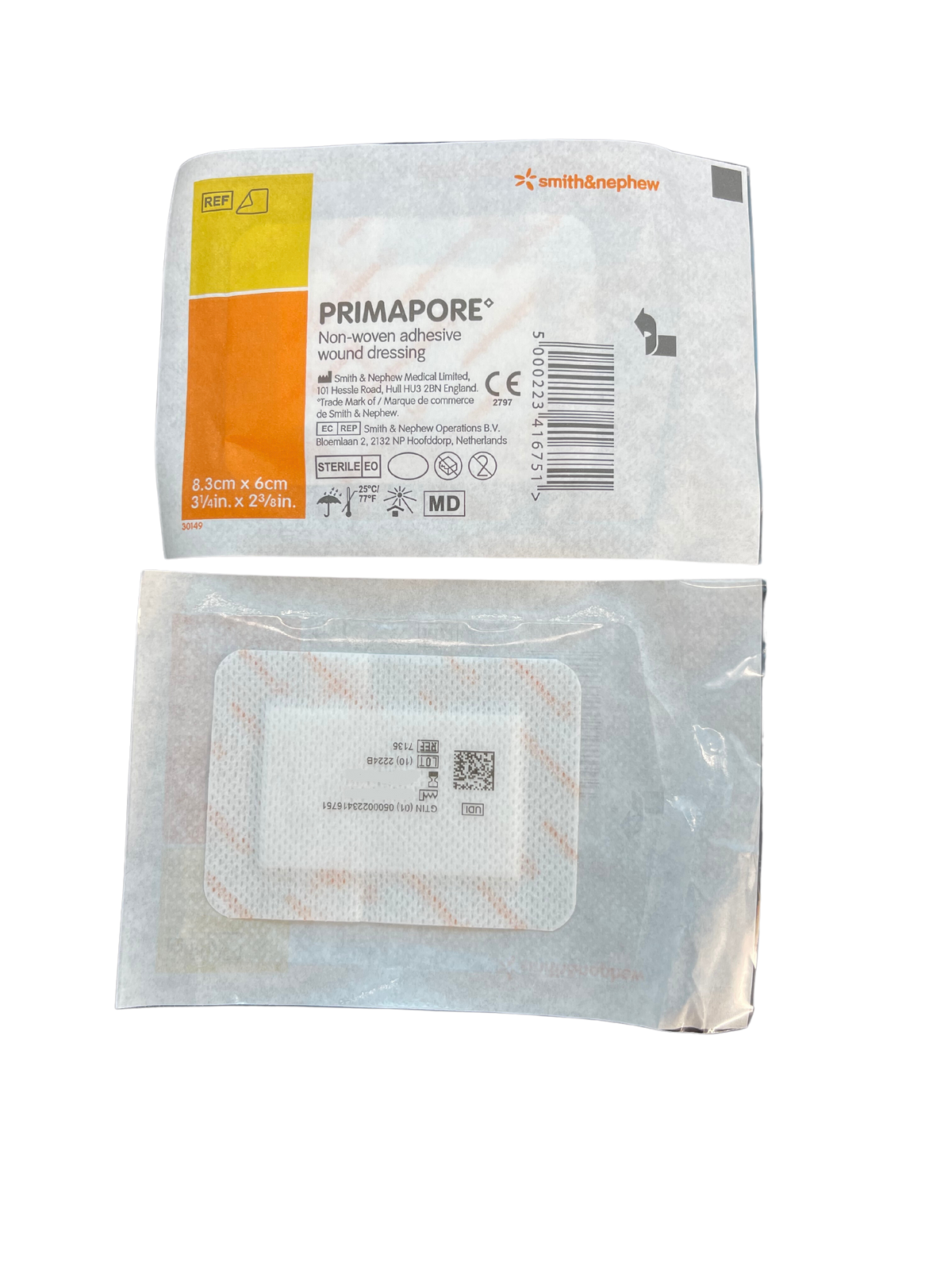 PRIMAPORE ISLAND DRESSING 8.3cmx6cm (PAD 5.7cmx3.5cm) Primapore dressings combine an absorbent pad with a soft and conformable fixative layer for the simple and effective management of sutured wounds. Primapore features: Soft breathable cover Highly absorbent Melolin pad Low allergy secure adhesive Conformable pad to all wound sites