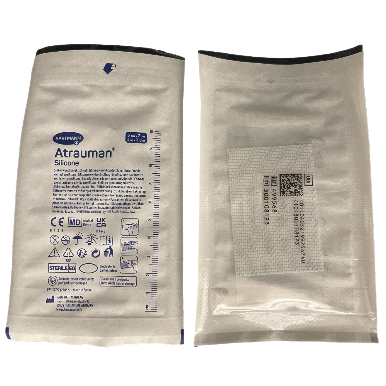 Atrauman Silicone is a soft and permeable wound contact layer made of a polyethylene terephthalate (PET) mesh as carrier material which is coated on both sides with (polydimethylsiloxane-based) silicone gel. Atrauman Silicone is designed to prevent sticking to the wound bed. The thin, soft and drapable carrier material enables good contact with the wound bed. The product is designed to reduce pain and to be removed atraumatically from the wound. Atrauman Silicone is a single-use wound contact layer for the treatment of superficial, acute and chronic, slightly to moderately exuding wounds, only applied by professional users. Atrauman Silicone may be applied as a primary dressing in combination with an absorbent secondary wound dressing. Atrauman Silicone functions as protection before adhering the secondary dressing or the negative pressure dressing over the wound. This wound contact layer is permeable for exudate. Furthermore, Atrauman Silicone may be applied as a protective layer on non-exuding wounds and on sites with sensitive skin.