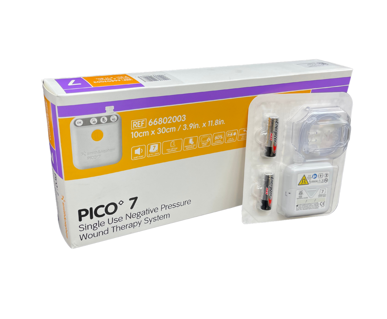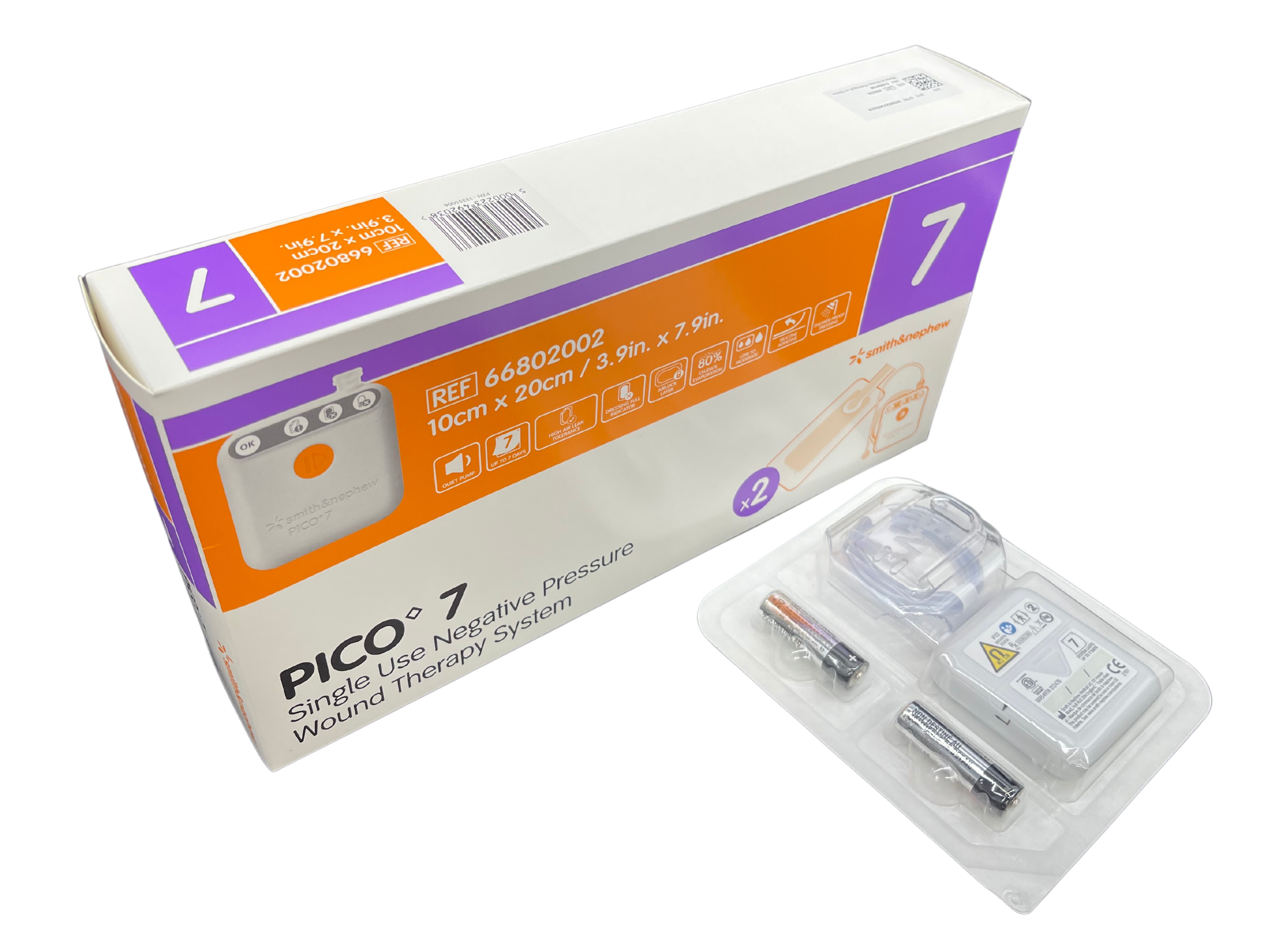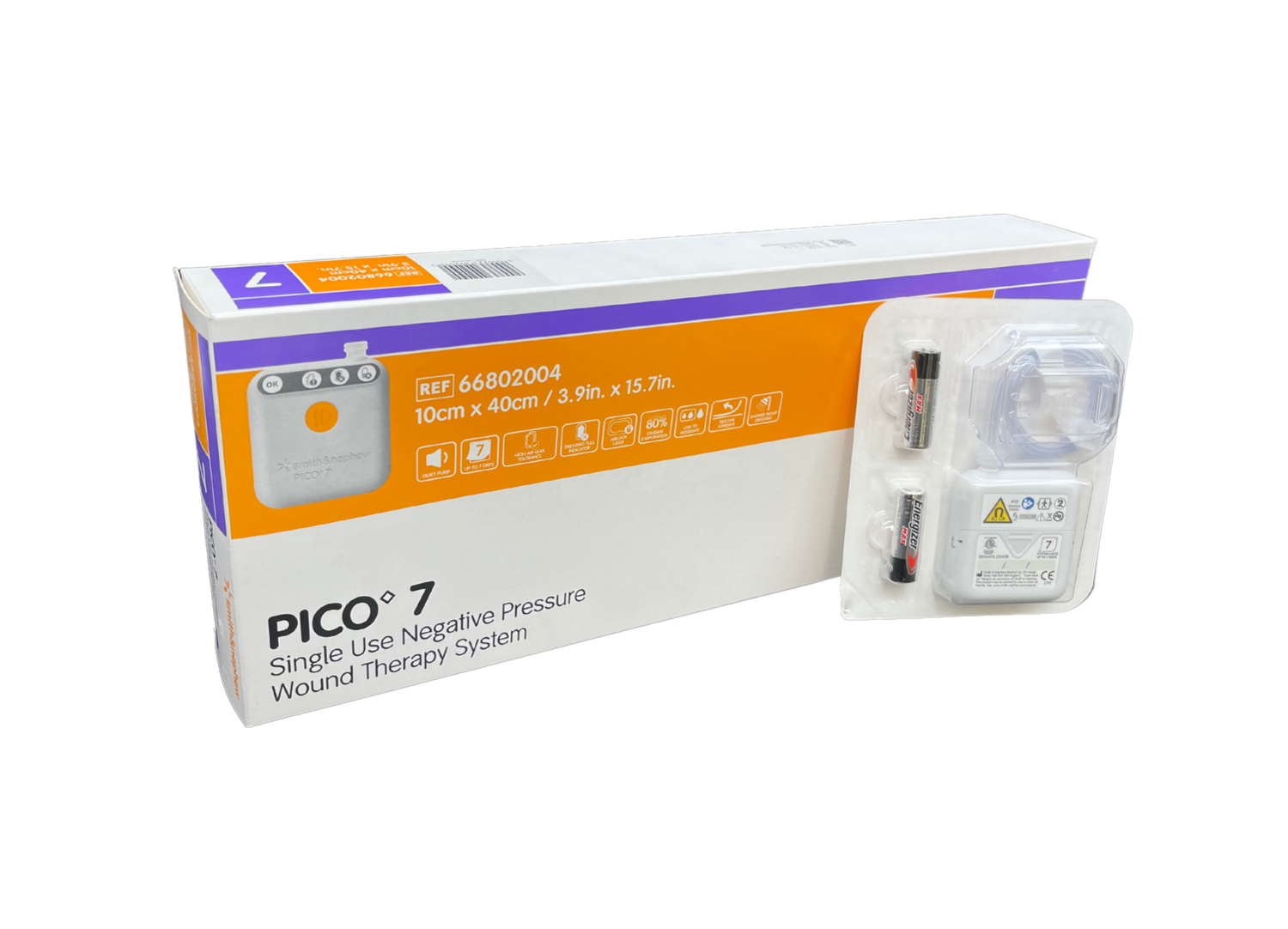 PICO 7 Single Use Negative Pressure Wound Therapy System (sNPWT) technology is completely portable and clinically effective in the treatment of chronic, acute; traumatic; subacute and dehisced wounds; partial thickness burns; ulcers; flaps and grafts; closed surgical incisions. Suitable for use in both a home care and hospital setting.