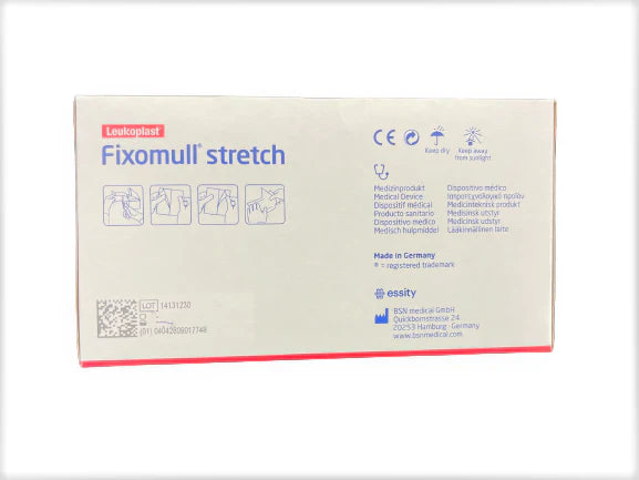 Fixomull Stretch is a wide area adhesive tape made from a white, stretchable, non-woven polyester dressing sheet coated with skin-friendly polyacrylate adhesive on quick-release backing paper. The adhesive ensures the dressing is firmly secured on all sides and cannot slip or become detached.